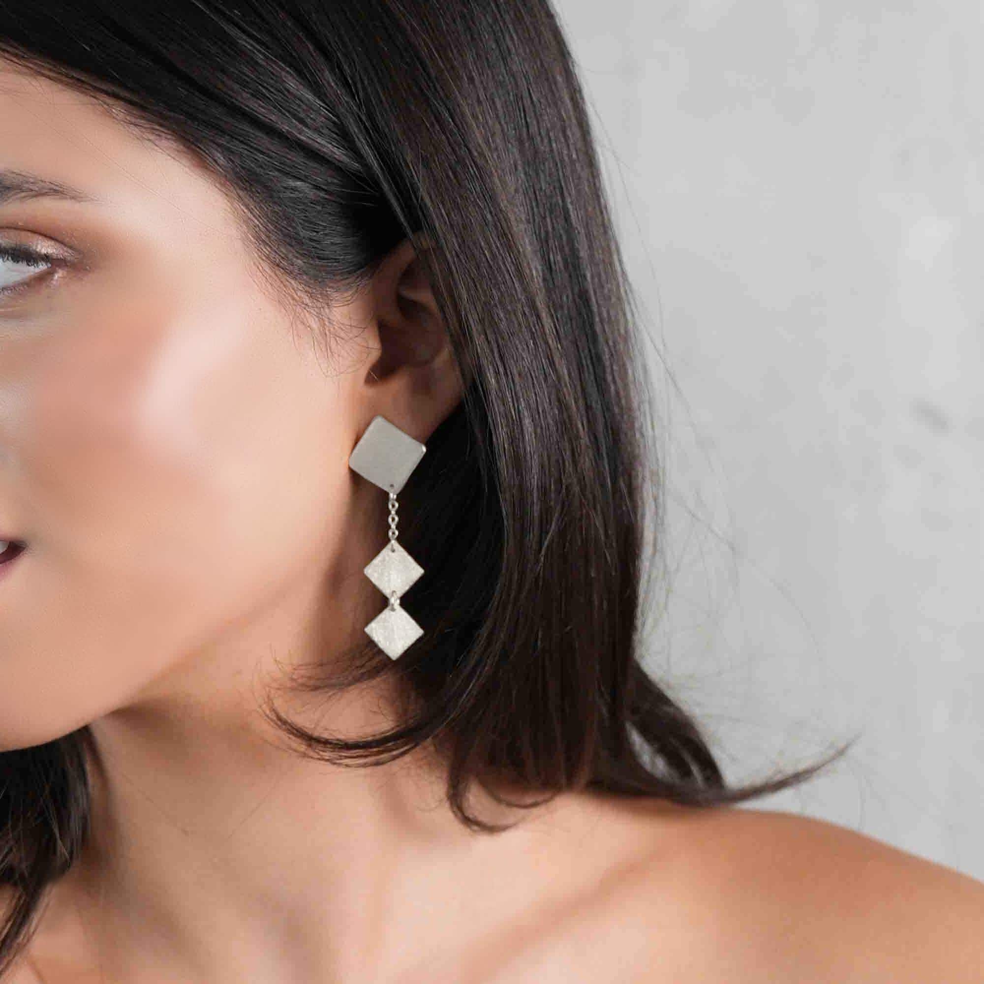 Elegant and light weight stud earrings with three squares cascading off each other by a delicate chain. The top square is the largest of the three and serves as the stud element for this chic earring. From this element hangs a delicate chain and then two smaller squares. All elements are attached by their corner creating an interesting take of an offside or diamond shape.