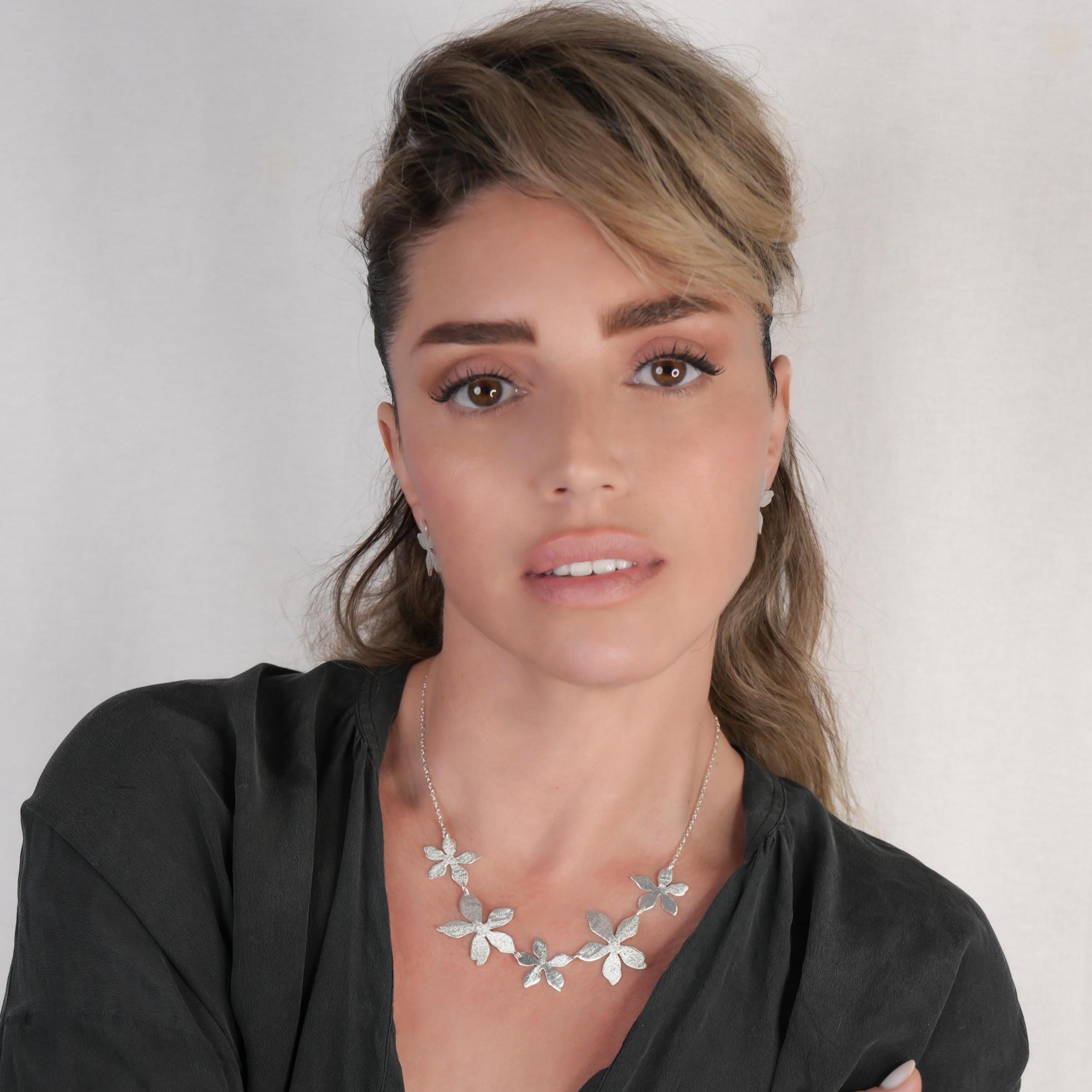 This lovely set is made of one necklace and one pair of stud earrings. The necklace is a beautiful and elegant this modern interpretation of the classic flower shape finds form as a minimal silhouette. This short collar necklace may be adjusted to fit your needs and is composed of a chain of five a-symmetric flowers. Comfortable to wear all day its modern free form design makes it an easy choice for almost any outfit.