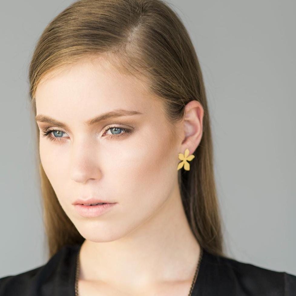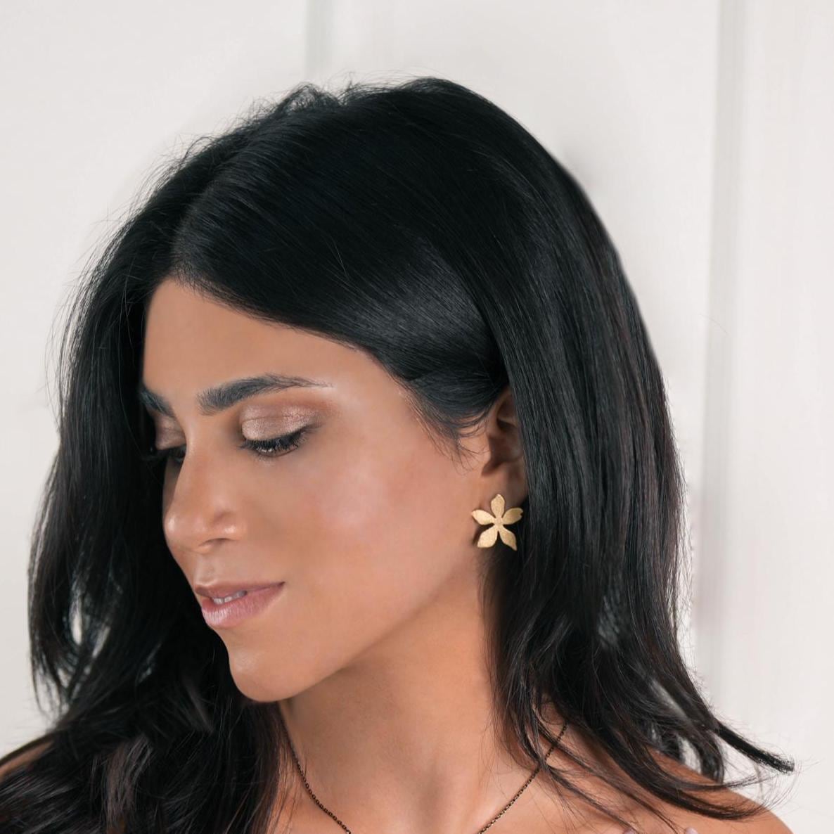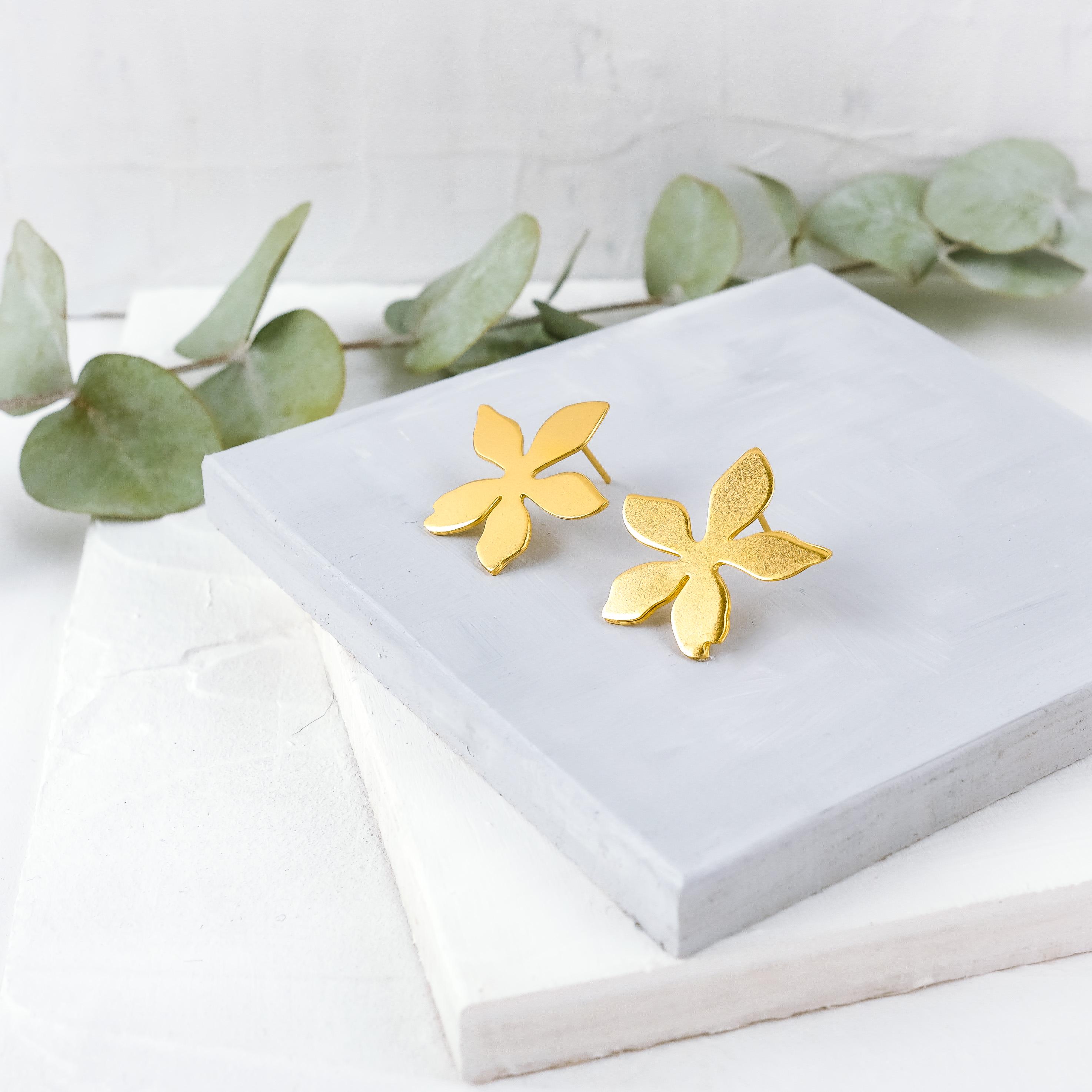Minimal Botanical Gold Jewelry Set Necklace and Stud Earring with Silhouette Flower Elements