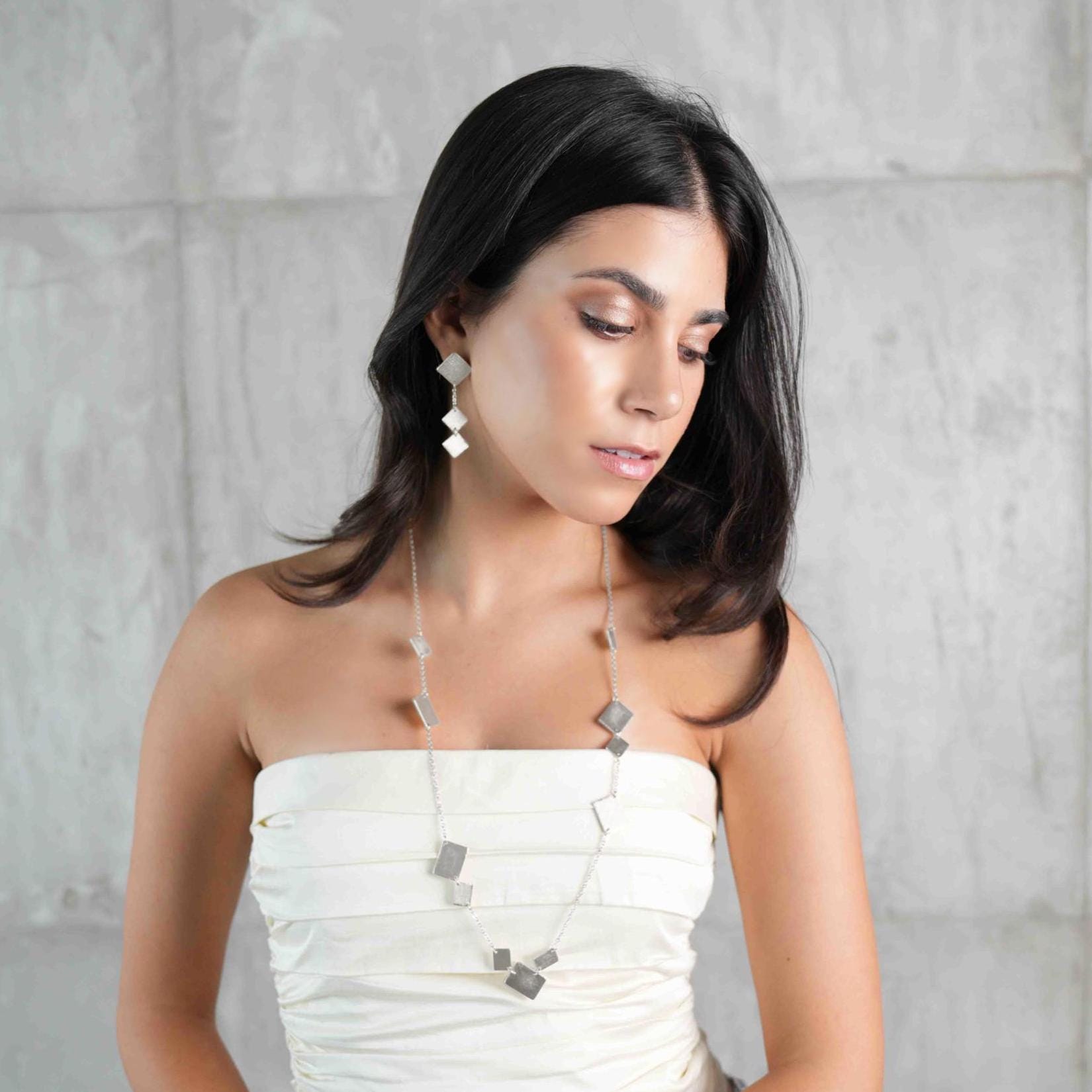 Long, Modern and Minimalist Geometric Gold Chain Necklace and Matching Earrings with Rectangles Elements