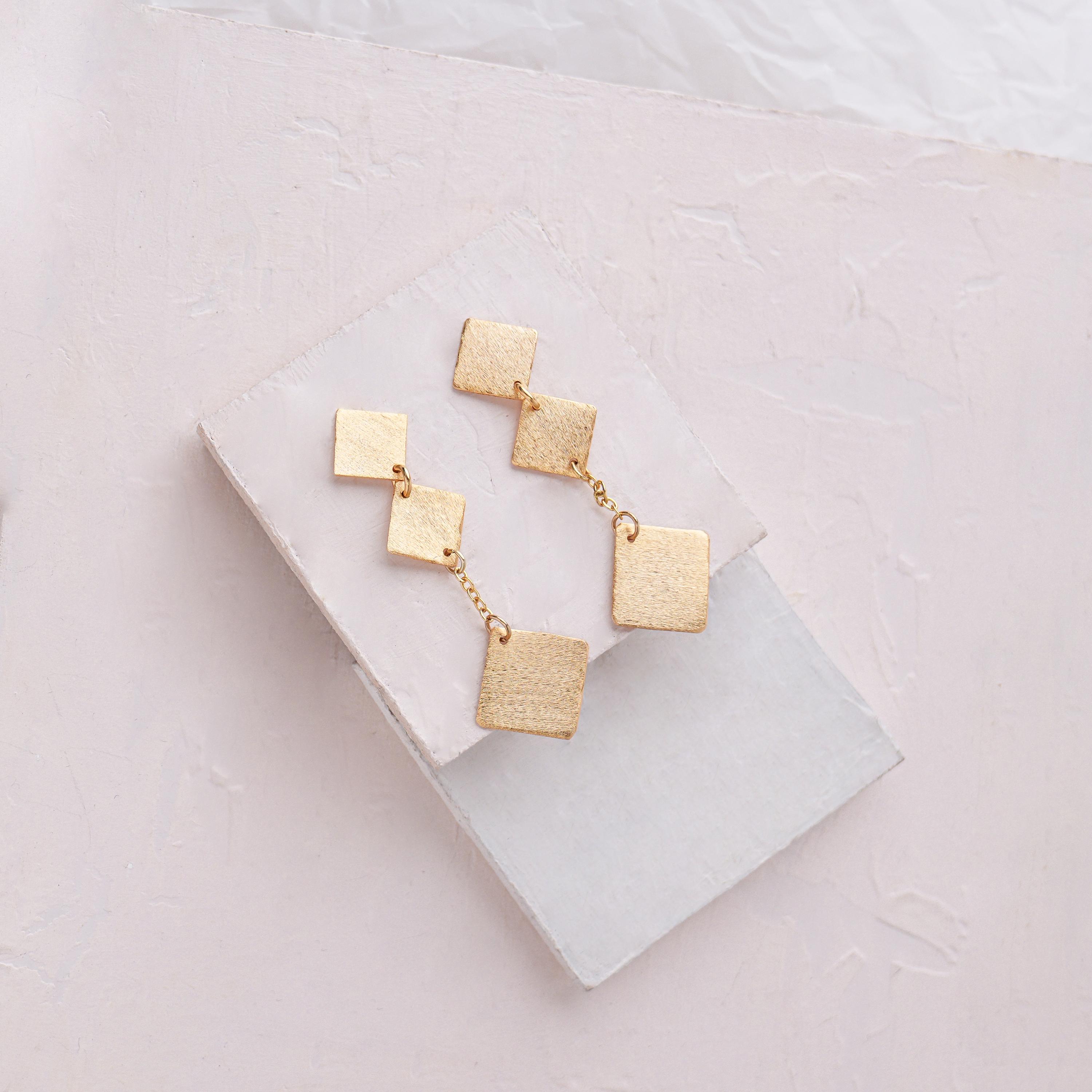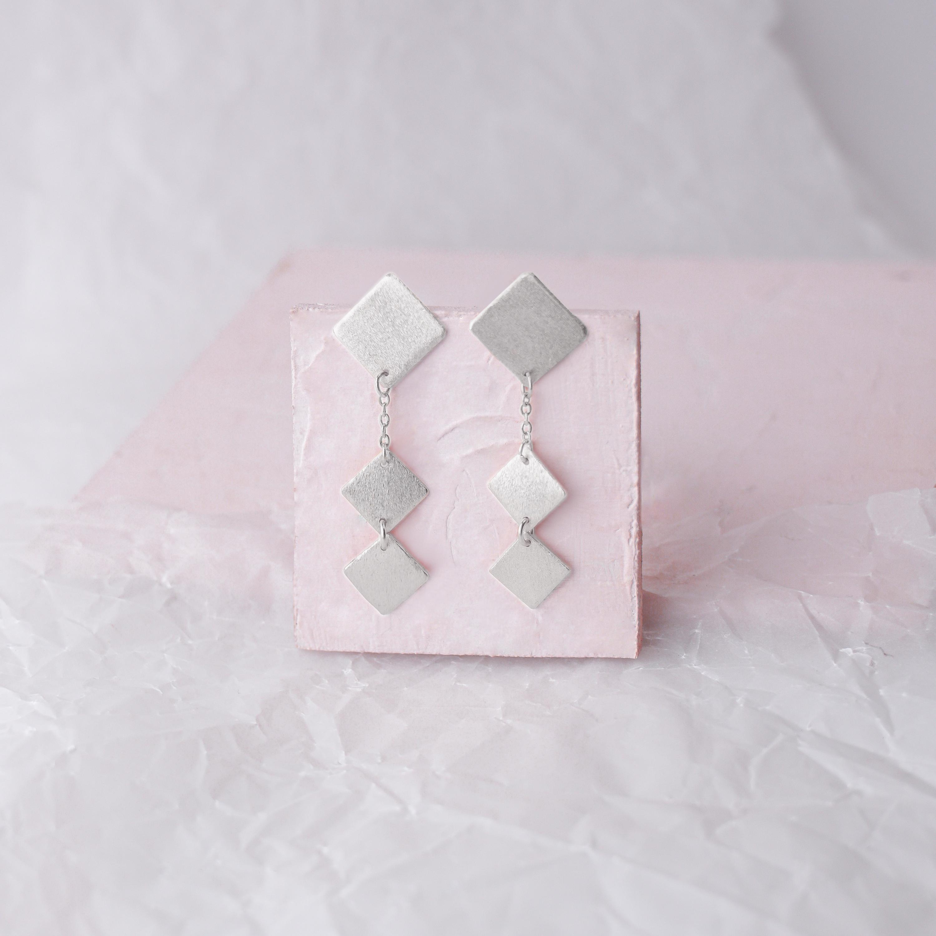 The earrings are elegant and light weight stud earrings with three squares cascading off each other by a delicate chain. The top square is the largest of the three and serves as the stud element for this chic earring. From this element hangs a delicate chain and then two smaller squares. All elements are attached by their corner creating an interesting take of an offside or diamond shape.